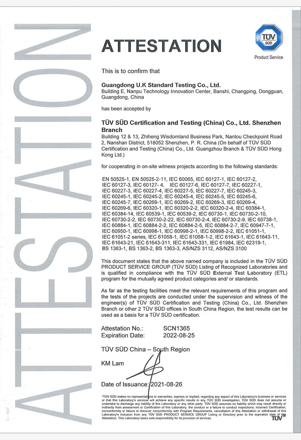 廣東優科檢測認證有限公司(簡稱:UKK)成?于2007年,是國內專業的汽車整車及零部件、電子元器件第三方檢測實驗室,國家級中小企業公共(技術)服務示范平臺,獲得了國家?新技術企業、廣東省專精特新中小企業、市級工程技術研發中心等榮譽稱號。 More
